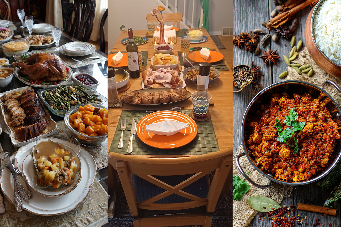 Over the next few years, I celebrated many holidays with my new in-laws, and I became wiser in the ways of Thanksgiving. It didn’t take me very long to realize that while turkey was traditionally the centerpiece, it was also famously bland, tasteless, and uninspiring. I learned that in the ongoing debate—turkey or sides?—the sides usually win. I also learned that it’s not really about a particular dish. It’s the combination of flavors—turkey, stuffing, and cranberry sauce melting together in your mouth. It’s really about the layering of unique ingredients and twists by different generations, woven into different immigrant stories and experiences. Like the classic Thanksgiving turkey, flavored with the 23 different Chinese spices in a special (secret) rub made by my Hong Kong born sister in law. Like the Polish Kielbasa stuffing, or the masala turkey. It’s also not about the first, formal sit down meal but the seconds and thirds, and the leftovers made into different combinations: the classic turkey sandwich, turkey breakfast casserole, turkey leftover biryani. It’s this mix of harvest ingredients from a partially imagined pilgrim past, layered with tastes and variations from immigrant families around the globe, that makes Thanksgiving quintessentially North American.