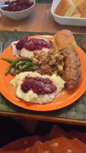 This week, your social media, like mine, will be filled with envy-inspiring images of the perfect Thanksgiving meal: a rich, burnished turkey, surrounded by some classic sides, mashed potatoes, green bean casserole, stuffing, and of course pie of various kinds. Or perhaps you will encounter or make some vegan or vegetarian alternatives or an Indian- flavored Thanksgiving spread, the most satisfying mixture of all. I have come to love all these varied takes on the Thanksgiving meal, but my first Thanksgiving featured none of these.