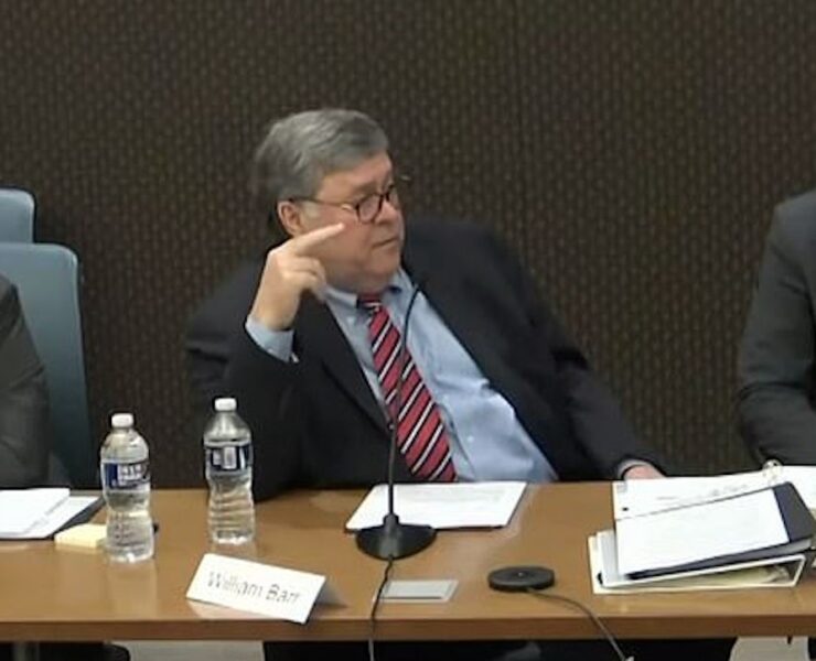 Bill Barr Seen Laughing at Mention of Dinesh D’Souza’s Film Propagating Election Lies During Jan. 6 Committee Hearing